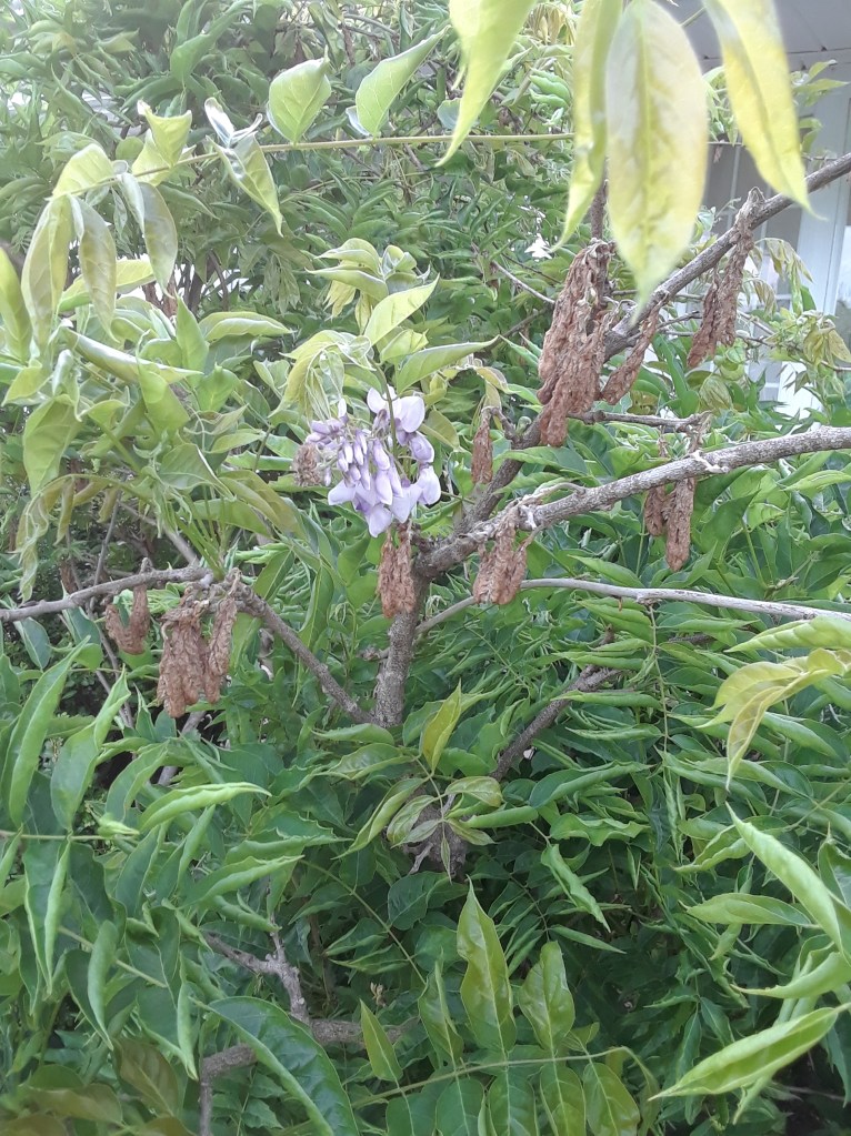 I thought I could be more successful because decades ago at my first house, I had a wisteria bush that bloomed and behaved itself. However, every year this one bloomed, but mostly sent out long runners almost reaching as far as my neighbor’s yard, as if it missed her. We were both amazed that it bloomed, so I forgave it for overstepping its boundaries.